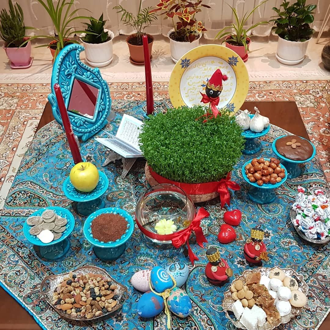 همچنین در ایام پیش از عید نوروز در شب آخرین چهارشنبه ی سال (سه شنبه شب) مراسم چهارشنبه سوری و آتش بازی برگزار می شود و مردم در آخرین پنجشنبه ی سال بر سر مزار و آرامگاه درگذشتگان می روند. مراسم تحویل سال نو در کنار تازه درگذشتگان نیز از دیگر آداب نوروز به شمار می رود. تهیه و پهن کردن سفره ی هفت سین، بزرگ ترین نماد عید نوروز، یکی از مهم ترین رسوم رایج در مناطق مختلف ایران و از آیین های مشترک در بین تمامی اقوامی است که نوروز را جشن می گیرند. در این سفره هفت چیز که با حرف سین آغاز می شوند نظیر:سماق، سیر، سِنجِد، سَمَنو، سکه، سرکه، سبزه که هر یک دارای مفاهیم و نشانه هایی از عشق و محبت، زندگی، برکت، رزق و روزی و سلامتی است چیده می شوند. در این سفره همچنین کتاب مقدس مسلمانان، قرآن، آیینه، نمادی از رفع کدورت و نشانی از صفا و یکرنگی، ماهی کوچک قرمز جهت شگون در تُنگ آب، با نمادی از پاکی، روشنایی و گشایش کار، سیب نمادی از تن درستی، شمع، با نشانه ی نور و درخشش، گل سنبل و تخم مرغ های تزیین و رنگ شده جهت زیبایی سفره، به همراه آجیل و شیرینی و خوراکی های سنتی، کتاب شعر حافظ، شاهنامه و غیره به فراخور هر منطقه قرار می گیرد.