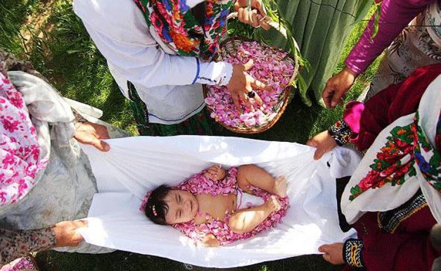 طبق اعتقادات مردم محلی، غلتاندن نوزاد در بین برگ های گل محمدی موجب سرزندگی و شادابی نوزاد می شود و علاوه بر این، طراوت برگ های این گل خوشرنگ و معطر از پوست نوزاد محافظت کرده و مصون ماندن از انواع بیماری ها و خوش رویی نوزاد را به دنبال دارد. مراسم گل غلتان از هنگام تولد تا زمان یک سالگی نوزاد انجام می شود. بر اساس این آیین سنتی، برای نوزادانی که در فصل بهار متولد می شوند، در دهمین روز از تولد آنان، پس از حمام و غسلِ روز دهم نوزاد مراسم گل غلتان را انجام می دهند و برای نوزادانی که در فصول دیگر سال متولد می شوند نیز این رسم را در اولین فصل بهار پس از تولد آنان برگزار می کنند. در فصل بهار هم زمان با رویش گل های محمدی تعدادی از بانوانِ خانواده ی نوزاد تازه متولد شده در ساعات آغازین صبح برای چیدن گل به مزارع و باغ های گل محمدی رفته و با همراهی صلوات و خواندن اشعار به جمع آوری گل برای اجرای این مراسم می پردازند. پس از اتمام جمع آوری گل های چیده شده آن ها را پرپر می کنند. چهار تَن از بانوان هر یک چهار گوشة پارچه ای سفید رنگ را گرفته و در میان آن گل های پرپر شده را می ریزند. پس از حمام و خشک کردن بدن نوزاد، او را در میان این پارچه ی پر گل نهاده و همراه با ذکر نام پنج تن، ختم صلوات، با خواندن اشعار و ابیاتی و توصیفِ زیباییهای کودک خود شروع به انجام این آیین و غلتاندن و تطهیر بدن نوزاد در بین برگ گل ها می نمایند. پس از اتمام مراسم از مهمانان با نوشیدنی و شیرینی پذیرائی می شود.
